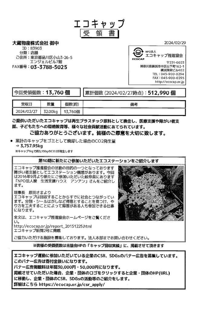 株式会社大蔵物産株式会社(エンジェルグループ)は、プラスチックごみをださないために、メーカーにはつくる責任を、消費者にはつかう責任、「エコキャップ回収活動」に参加しました。